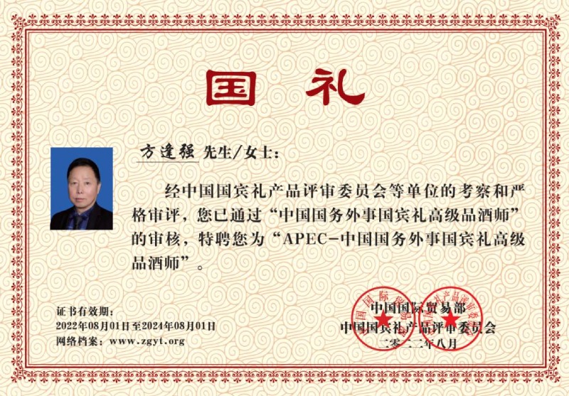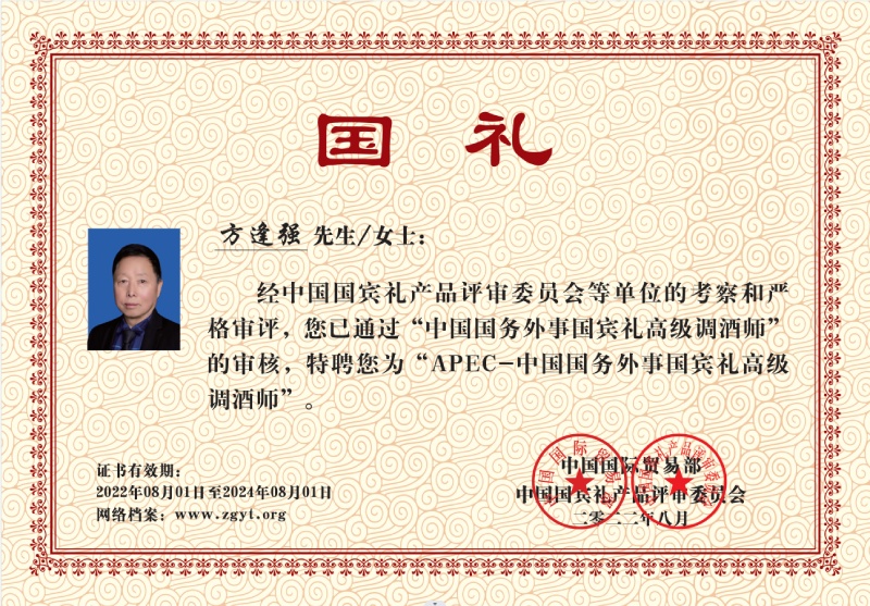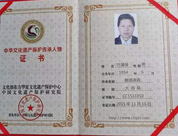 方逢强生于1954年1973年19岁开始从实酿酒工作,1975年随师学8年调酒品酒工作,一直到2017年退休。44年时光用在酱香型白酒勾调与品尝。数十年历练:52度至54度之间酱香白酒勾调出美酒;独特经历拥有独特结晶:用望、闻、搓、品尝方法,大概率知道其酒的酒精浓度。特别是以观其色、闻其香、品其味的方法断定酒中的酸甜苦辣糊枯涩等7大味的相生相克原理,调出极品好酒。在中国酒行业,他有着极好的调酒品德及口碑,在酒行业是出色的品酒师。