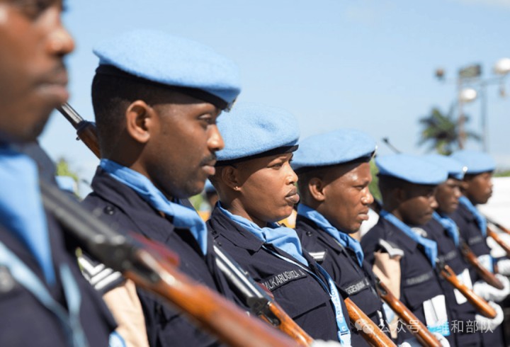 一支来自卢旺达的组建警察单位,在海地与特遣团(MINUJUSTH)一同服役,立正立正。联合国照片/莱奥诺拉·鲍曼