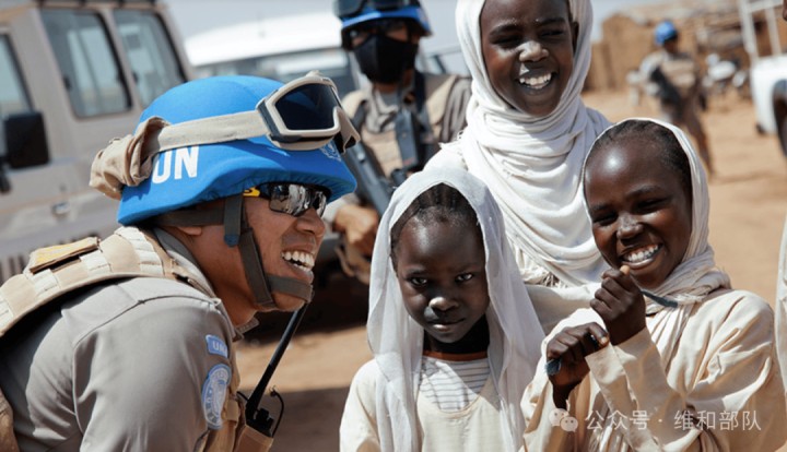 联合国非洲联盟维和部队(UNAMID)印度尼西亚民警中校叶尼·温达尔蒂在一次晨间巡逻中,于阿布舒克境内流离失所者营地(北达尔富尔)的一个水源点与妇女和儿童互动。联合国照片/阿尔伯特·冈萨雷斯·法兰