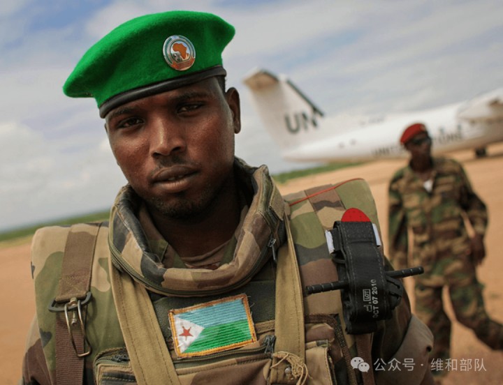 一名隶属于吉布提代表团的士兵,隶属于非洲联盟索马里特派团(AMISOM),在联合国飞机准备从贝莱特·韦恩机场起飞时守卫。AU照片/斯图尔特·普赖斯