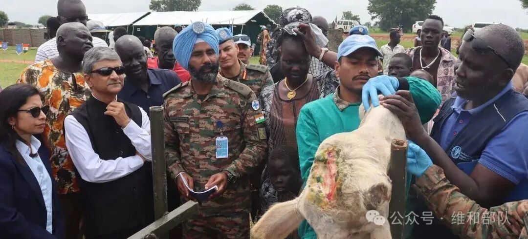 为缓解紧张局势并改善民生,南苏丹特派团印度维和人员在琼莱州开展了兽医诊疗活动,治疗动物疾病,提供预防性护理并免费发放药品。