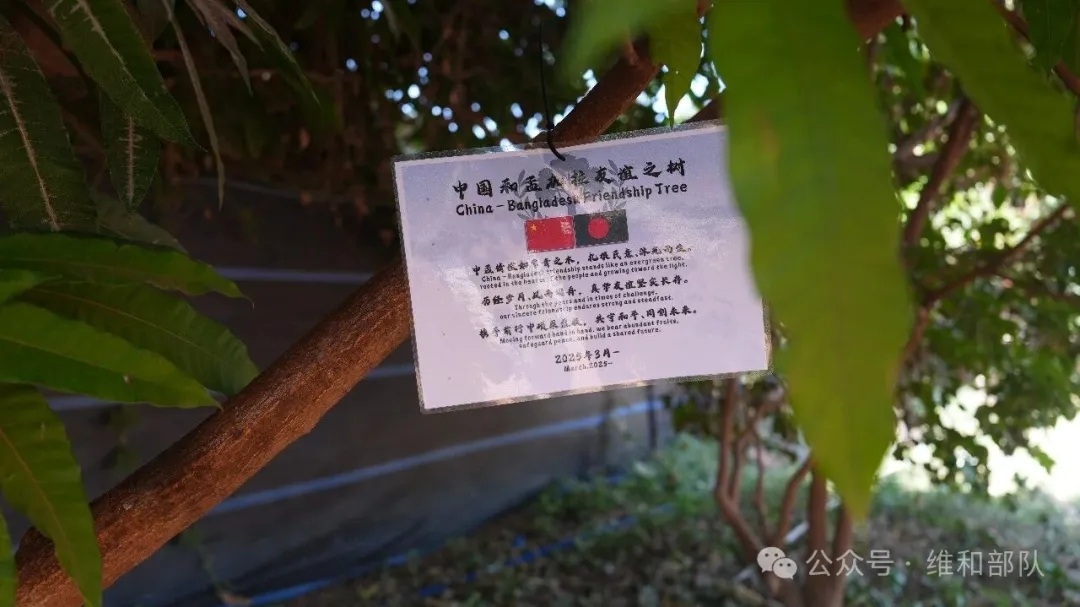 在营区一角,此前种下的中孟友谊芒果树早已枝繁叶茂、硕果累累,碧绿的芒果挂满枝头。这棵芒果树,源自一次惊心动魄的前沿撤离任务。此前,阿卜耶伊局势紧张,孟加拉国维和步兵营官兵身处前沿阵地,安全形势严峻。中国维和直升机分队临危受命,冒着风险高效完成兵力回撤、人员转运和物资投送,成功帮助孟加拉国友军安全撤离高危任务区域。为感谢中国蓝盔的硬核支援与生死相助,孟加拉国特意赠送一颗芒果树苗。从一株小树苗到枝繁叶茂、开花结果,正是中孟两国维和官兵患难与共、友谊开花结果的见证。官兵在植树节当天重新挂牌,在果香中重温携手维和的温暖瞬间。