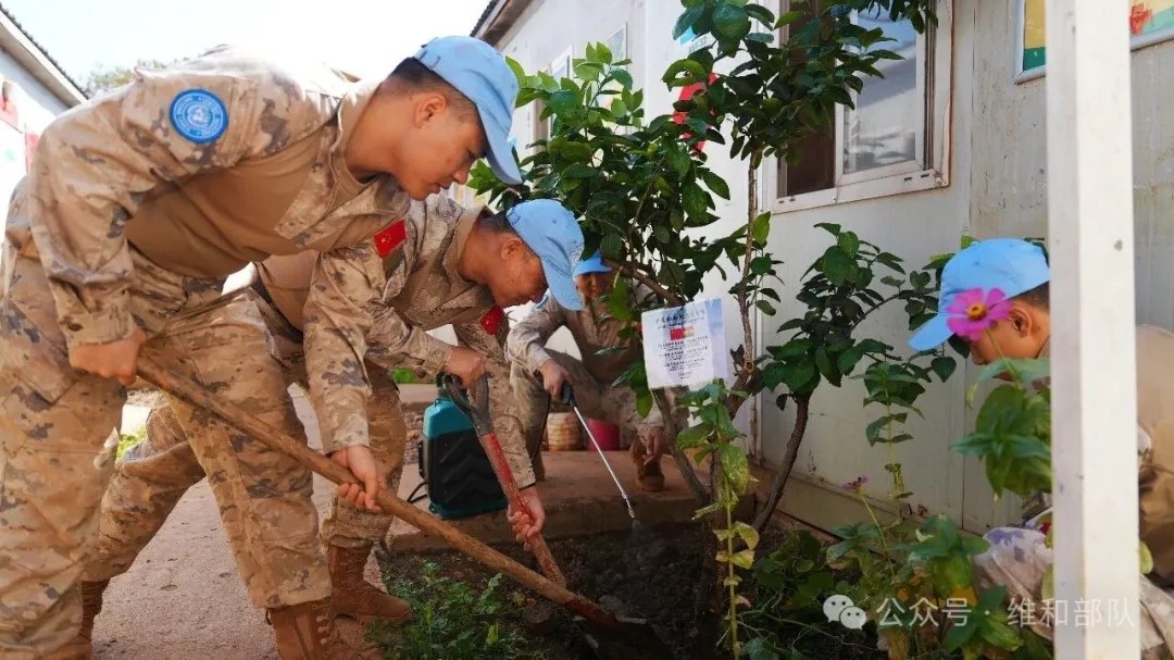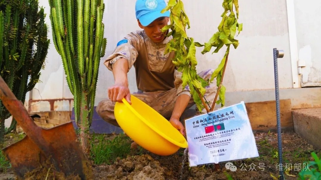 在我国第48个植树节到来之际,中国第六批赴阿卜耶伊维和直升机分队在任务区营区开展植树活动,官兵栽下各国赠予的友谊之树,以一抹新绿见证中国与各国守望相助、共护和平的深厚友谊。