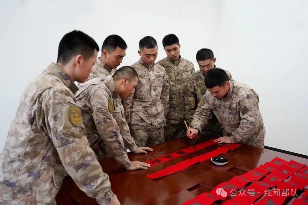 入伍十二年,从艺术生到战地记者,从书法爱好者到中非文化交流使者,韩瑞田始终坚守“以文铸魂、以艺报国”的信念。入伍前他是书法艺术生,笔墨丹青是他青春的底色。初到部队,他并未因训练繁重而放下纸笔。训练间隙,他常在帐篷角落铺开宣纸,一笔一画,练字不辍。他主动承担单位板报绘制、节日春联书写等任务,一幅幅春联,不仅传递年味,更饱含军人风骨。十二年来,他亲手书写春联逾千幅,字字如枪,句句如誓,成为战友们心中“有温度的军营文化符号”。