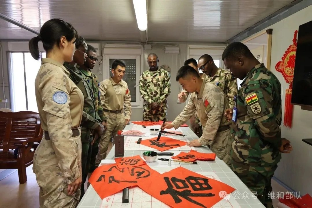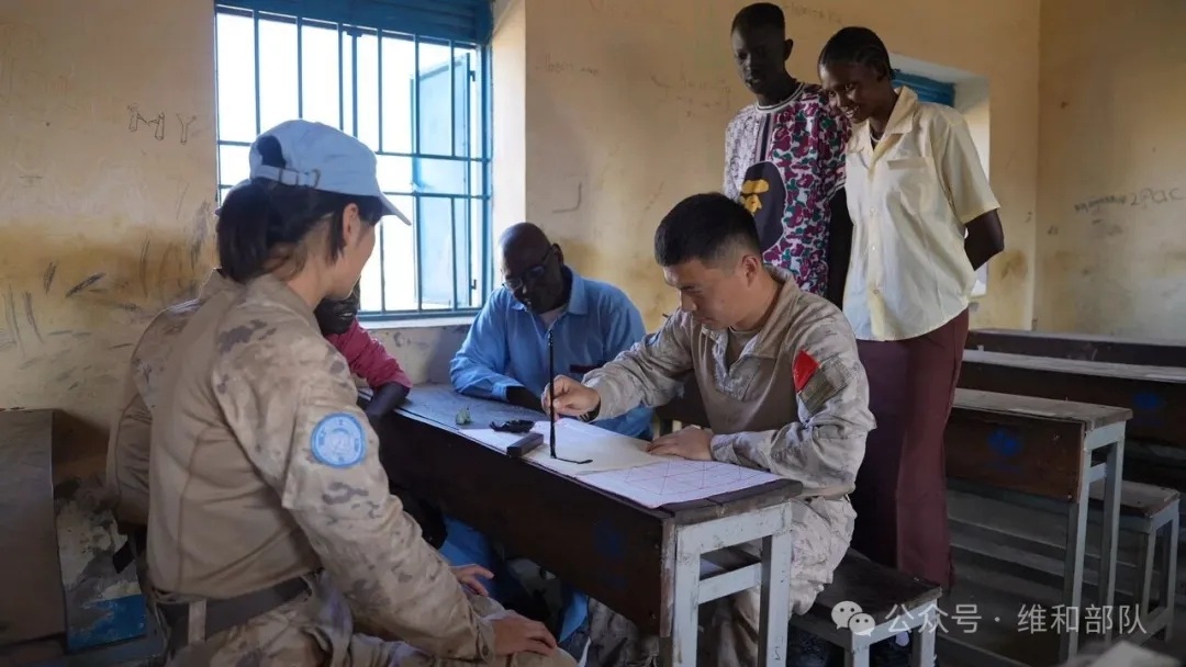 更令人称道的是,韩瑞田还肩负着“中非文化交流大使”的使命。在维和任务区重大节日、慰问演出和国际交流活动中,他主动登台,为外国友人现场讲解中国传统书法,挥毫泼墨,赠送作品。一纸一墨,皆是中华文化的精魂;一笔一划,皆是和平的诗意表达。他用文化为媒,架起中非友谊的桥梁,让世界看到中国军人不仅有钢铁意志,更有诗与远方。