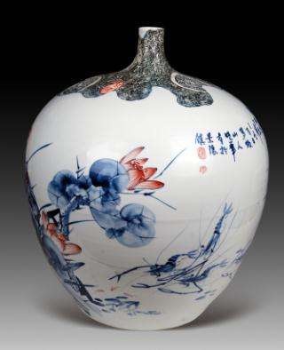 采用青花工艺、梅瓶造型,梅瓶由景德镇向全国征集经大师严格评审选定,整个器形典雅大方,白如碧玉。构图按照“密不可透风,空可以跑马”的美学法则,整体器形典雅大方。瓶身一面是古希腊卫城,另一面是万里长城,象征着奥林匹克从发源地来到了中国。瓷瓶的颈部绘有橄榄枝花环,取“世界和平”之意,为熊钢如大师绘制;瓷瓶下部苍柏环抱是王锡良大师绘制,象征奥运精神万古长青;云雾山色的“天青过雨景”是王恩怀大师手笔。其“天青过雨”的釉色决定了国礼青花瓷是青花瓷上品中的上品,也是最美丽的颜色。传说中这种釉色必须在烟雨天才能烧出来。品鉴专家一致认定:该款瓷精妙绝伦,富于禅意,体现了中国瓷艺的最高成就,堪称当代青花瓷王。