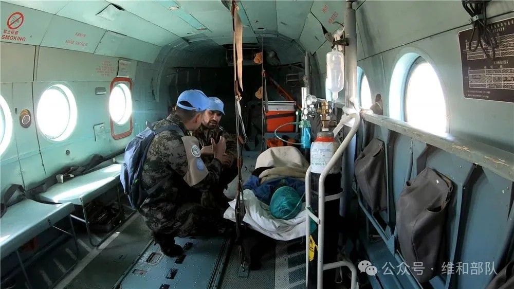中国赴非盟-达尔富尔混合行动直升机分队紧急转运受伤的冈比亚维和警察。