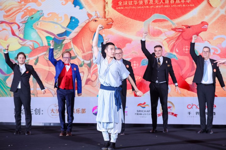 随后的互动环节《少林五行拳》邀请多位使节及嘉宾上台体验,在教练指导下感受龙、虎、豹、蛇、鹤五种形态的拳法意蕴,现场气氛热烈。