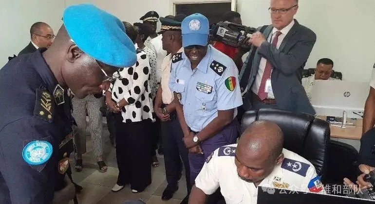 联合国海地综合办事处警务总监帕帕·桑巴·姆博吉(后中)与联合国支持的海地警察部队成员在一起,正在对新招募人员进行背景审查