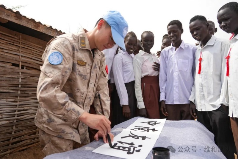 谷雨时节,翰墨飘香。连日来,中国第十二批赴南苏丹(朱巴)维和步兵营结合常态化开展人道主义援助工作,以第17个联合国中文日为契机,分批次走进流民所希望小学、纳卡屯小学等多所当地学校,组织多场“翰墨传情・共话和平”主题文化活动。通过教写汉字、教唱歌曲、创意绘画、学说中文等趣味形式,为当地孩子们带来一堂堂别开生面的中华文化体验课,在孩子们心中播撒下友谊与和平的种子。