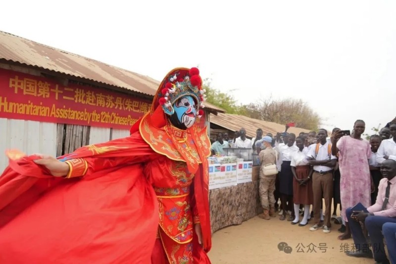 中国第十二批赴南苏丹(朱巴)维和步兵营前往UN House周边1号流民所希望小学开展人道主义援助活动。图为向师生展示川剧变脸。(杨仕伟摄)